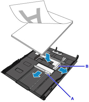 Przesuń prowadnicę papieru (B) z prawej strony, aby wyrównać lewą i prawą prowadnicę papieru z obiema krawędziami stosu arkuszy.