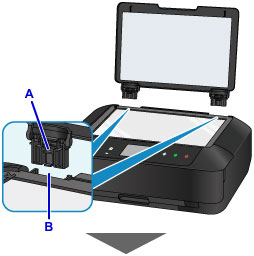 Dopasuj oba zawiasy (A) pokrywy dokumentów do uchwytów (B), a następnie włóż pionowo oba zawiasy pokrywy dokumentów w sposób przedstawiony na poniższej ilustracji.