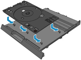 - 請務必將光碟托盤上的各個孔與紙匣 1後部相對應的掛鉤對齊。 如果光碟托盤未正確安裝,則在將紙匣 1插入本機的過程中光碟托盤可能會損壞。