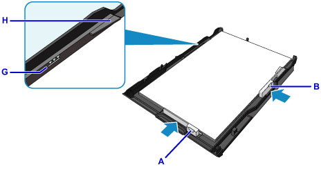 - Kağıt desteğinin yüksekliğini kağıt kılavuzlarının mandallarının (H) altında tutun.