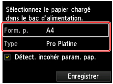L'écran d'enregistrement des informations sur le papier pour le bac d'alimentation s'affiche sur l'écran LCD.