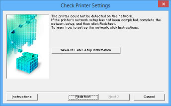 Jeśli nie można znaleźć drukarki, a ekran Sprawdź ustawienia drukarki (Check Printer Settings) jest wyświetlany po uruchomieniu wyszukiwania drukarki przy użyciu opcji Wyszukiwanie automatyczne (Automatic search) na ekranie Szukaj drukarek (Search for Printers), kliknij pozycję Wykryj ponownie (Redetect), a następnie ponownie wyszukaj drukarkę według adresu IP na ekranie Szukaj drukarek (Search for Printers).