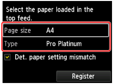 9. Select the size and type of paper loaded in the top feed at Page size and Type, select Register, then press the OK button.