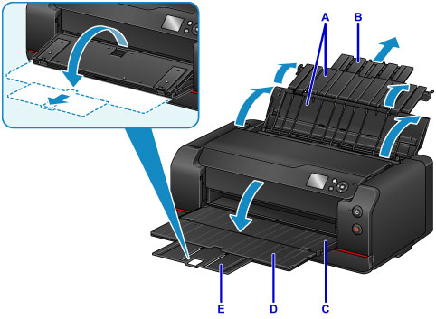 4. Open the output tray extension (D), then pull out the paper output support (E).
