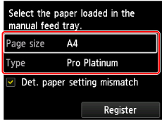 Select the size and type of paper loaded in the manual feed tray at Page size and Type, select Register, then press the OK button.