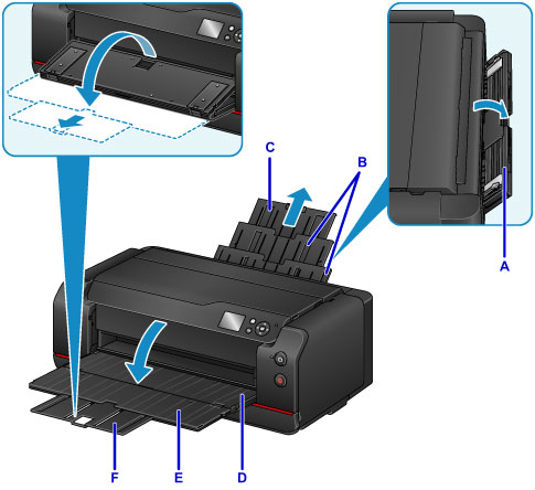 Open the output tray extension (E), then pull out the paper output support (F).