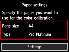 حدد Page size وType للورق المراد استخدامه، وحدد Settings، ثم اضغط على الزر موافق.
