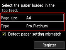 9. Selezionare il formato e il tipo di carta caricato nell'alimentatore superiore in For. pag. (Page size) e Tipo (Type), quindi selezionare Registra (Register).