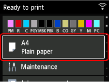 Velg visningsområde for papirinnstillinger på HJEM-skjermen ved å trykke på opp- eller ned-knappen, og trykk deretter på OK-knappen.