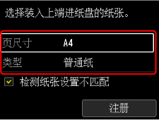 装入纸张后,会显示上端进纸盘的纸张信息注册屏幕。