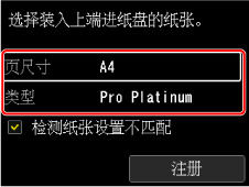 在页尺寸和类型中选择装入上端进纸盘的纸张尺寸和类型,选择注册,然后按OK按钮。