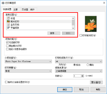 在快速设置选项卡上的常用设置中,选择合乎用途的打印配置文件。