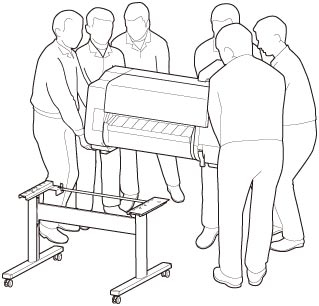 Moving the printer requires at least six people, holding it on both sides. Be careful to avoid back strain and other injuries.