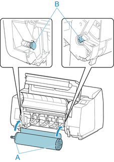 Tenga cuidado de no pillarse los dedos entre el eje del Soporte del rollo y los surcos de guía (B) cuando cargue el rollo de papel.