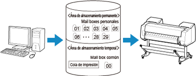 El área de almacenamiento del disco duro de la impresora se divide en un área de almacenamiento temporal y en un área de almacenamiento permanente. El área de almacenamiento temporal almacena los trabajos de impresión en la cola de trabajos o en un buzón compartido. El área de almacenamiento permanente almacena trabajos en cuadros personales.
