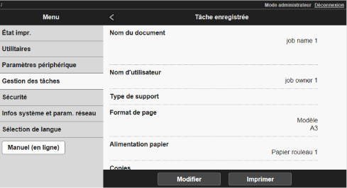 Les détails des tâches d'impression stockées sur le disque dur de l'imprimante (tâches enregistrées) peuvent être affichés comme suit.