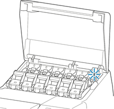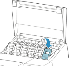 OK를 누르고 잉크 공급부가 아래를 향하고 금속 접촉부가 뒤를 향하도록 하여 잉크 탱크를 홀더에 삽입합니다.