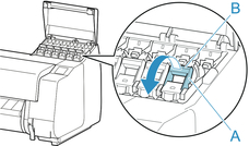 B 위치의 버튼을 누르면서 교체할 컬러의 잉크 탱크 잠금 레버의 손잡이 부분(A)을 앞으로 당깁니다.
