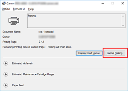 Utilizando o Canon IJ Status Monitor, é possível cancelar trabalhos de impressão que já foram recebidos pela impressora ou que estão sendo impressos no momento.