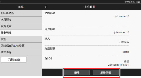 - 只要不从操作面板管理保留作业,这些作业将一直留在作业队列中。 在这种情况下,打印机会继续处理队列中的下一个作业,中间不会暂停。