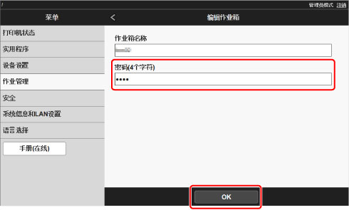 如果要提高安全性,可以为个人作业箱指定密码。 设置密码后,更改个人作业箱的设置,以及显示、打印、删除、移动和更改保存在个人作业箱内的作业时均需要该密码。