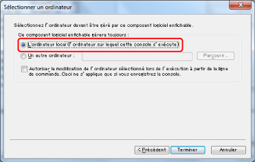 Sélectionnez Ordinateur local (Local computer) sur l'écran Sélectionner un ordinateur (Select computer) et sélectionnez Terminer (Finish).