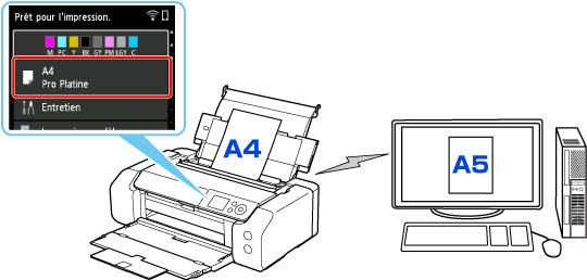 - Paramètres de papier indiqués dans le pilote d'imprimante lors de l'impression : A5