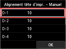 L'écran de saisie des valeurs d'alignement de la position de la tête d'impression s'affiche.