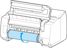 A l'aide des deux mains, faites tourner le Support du rouleau dans le sens de la flèche pour rembobiner le rouleau.