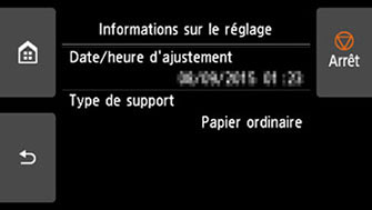 Vous pouvez confirmer la date/heure d'ajustement de l'étalonnage des couleurs et le type de support traité.