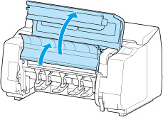 Aprire il coperchio superiore e sollevare la guida di uscita.