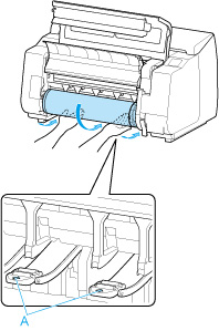 Tenere le flange (A) in modo che l'ingranaggio nero del supporto per rotolo si trovi a sinistra, allineare l'albero del supporto per rotolo con le scanalature di guida destra e sinistra dello slot supporto rotolo (B) ed eseguire il caricamento.
