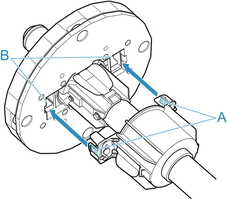 Allineare le linguette dell'attacco per rotolo da 3" (A) ai fori sul supporto per rotolo o blocco supporto (B) e inserirle a fondo.
