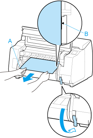 Tenere il bordo iniziale della carta in rotolo al centro e tirarlo delicatamente e in modo uniforme fino a raggiungere la posizione della guida di uscita (A). A questo punto, allineare il bordo destro della carta in rotolo parallelamente alla linea allineamento carta (B). Quando la carta è parallela alla linea, abbassare la leva di rilascio.