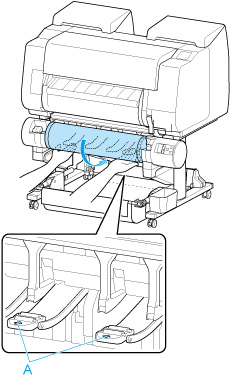 롤 용지를 균등하게 빼내고 앞 가장자리를 롤 용지와 바로 아래의 화살표(A) 사이에 삽입한 다음 소리가 들릴 때까지 롤 용지를 공급합니다.