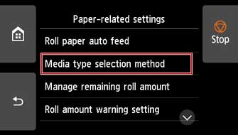 Ao carregar o papel em rolo, um menu para seleção do tipo de mídia é exibido na tela sensível ao toque. Toque no tipo de mídia.