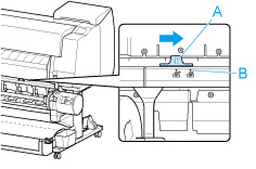 Empurre a alavanca (A) do fixador do suporte na direção do eixo para liberar o bloqueio e, enquanto mantém na posição (B), remova o fixador do suporte do Suporte do rolo.