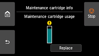 O cartucho de manutenção absorve o excesso de tinta a partir da limpeza da cabeça de impressão. É possível confirmar a capacidade restante do cartucho de manutenção verificando a tela sensível ao toque.
