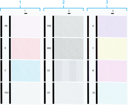 Просмотрите образец проверки сопел и выберите группу чернил, для которой необходимо выполнить очистку. Вы можете очистить все печатающая головка или выбрать образец 1, 2 или 3 для очистки печатающая головка с засоренным соплом.