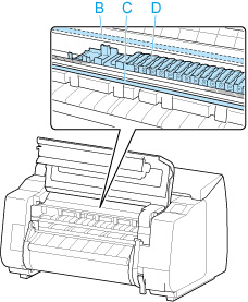 Не прикасайтесь к линейной шкале (B), валу каретки (C) или стабилизатору чернильной трубки (D). Это может привести к их повреждению.