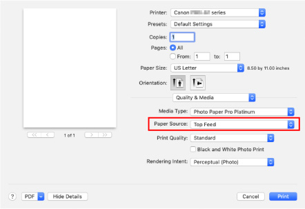 Válassza ki a Top Feed (Felső adagoló) lehetőséget a Paper Source (Papírforrás) opciónál.
