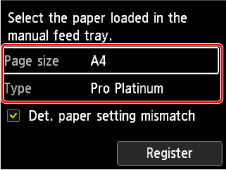 Izberite velikost in vrsto papirja v pladnju za ročno podajanje pri možnostih Vel. str. (Page size) in Vrsta (Type), izberite Registriraj (Register) ter pritisnite gumb OK.