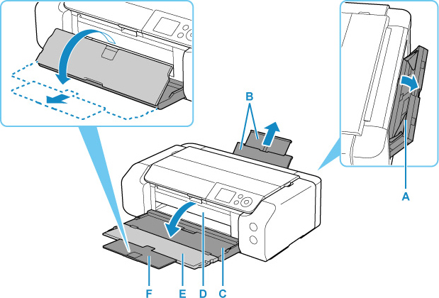 Odprite podaljšek izhodnega pladnja (E) in izvlecite oporo izhodnega papirja (F).