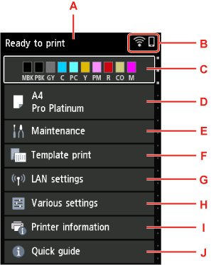 Prikaže stanje črnila. Če izberete ta element, lahko preverite preostalo količino črnila in številko modela črnilnega vložka.