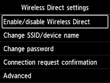 Izberite Omog./onem. nep. brezž. povez. (Enable/disable Wireless Direct) in pritisnite gumb OK.