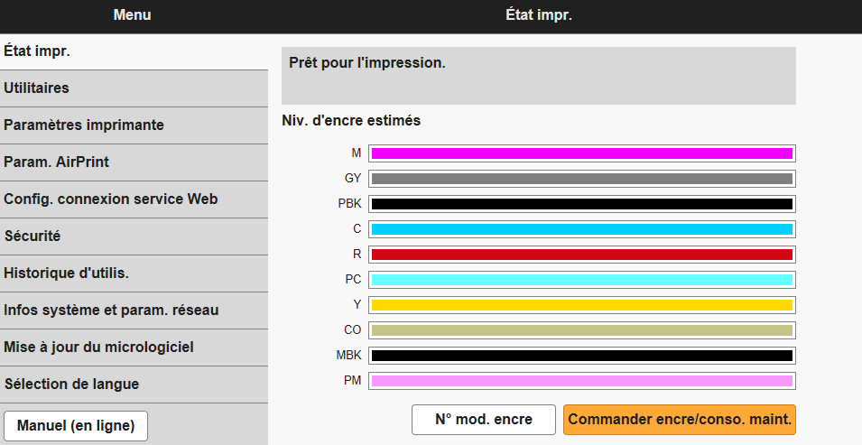 Cette fonction affiche des informations sur l'imprimante, telles que la quantité d'encre restante, l'état de la machine et des informations détaillées sur les erreurs.