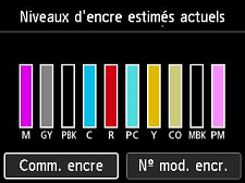 Sélectionnez Nº mod. encr. > Comm. encre pour obtenir des informations sur les points de vente d'encre.