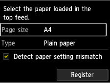 Dacă hârtia încărcată corespunde informaţiilor despre hârtie afişate pe ecranul LCD al imprimantei, selectaţi Înregistrare (Register).