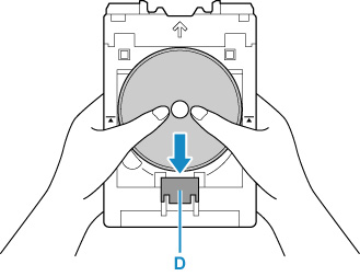 CU FAŢA DE IMPRIMARE ORIENTATĂ ÎN SUS, aşezaţi discul imprimabil şi apăsaţi-l pe siguranţa (D) din partea de jos.