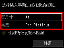 在页尺寸和类型中选择装入手动进纸托盘的纸张的尺寸和类型,然后选择注册。